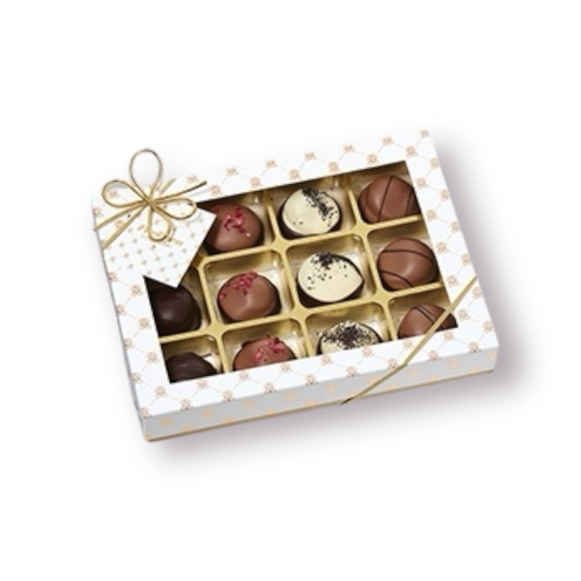 Gaveæske med 12 stk. minitærter. Indeholder 3 stk. Irish coffee, 3 stk. Orangetrøffel, 3 stk. Hindbærtrøffel og 3 stk. Lakridstrøffel.